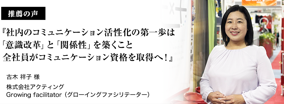 推薦の声 古木 祥子様 株式会社アクティング Growing facilitator(グローイングファシリテーター) - コミュニケーション資格講座・検定|コミュニケーション能力認定協会